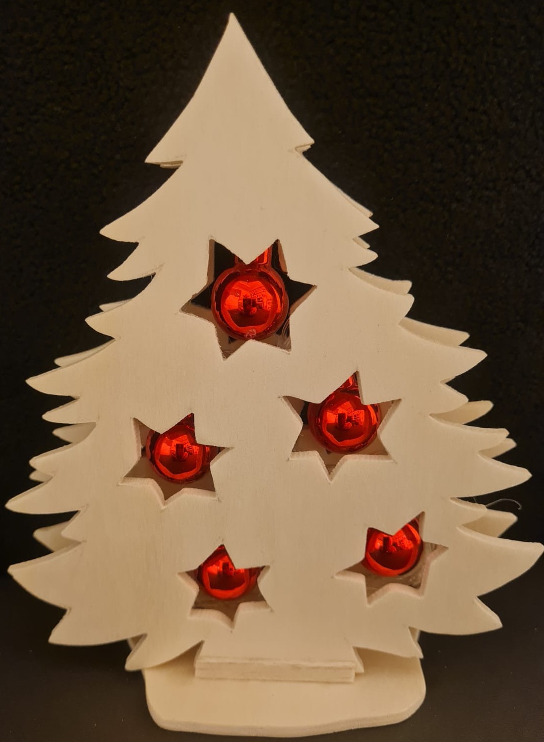 Dieser handgesägte Baum ist mit glänzenden roten oder goldenen Sternenornamenten dekoriert, die durch filigrane Sternausschnitte besonders zur Geltung kommen. Das minimalistische und moderne Design macht ihn zu einem vielseitigen Dekorationselement für verschiedene Räume. Egal, ob als Tischdeko oder auf einem Regal platziert – dieser Baum zieht mit seiner eleganten und stilvollen Gestaltung alle Blicke auf sich.