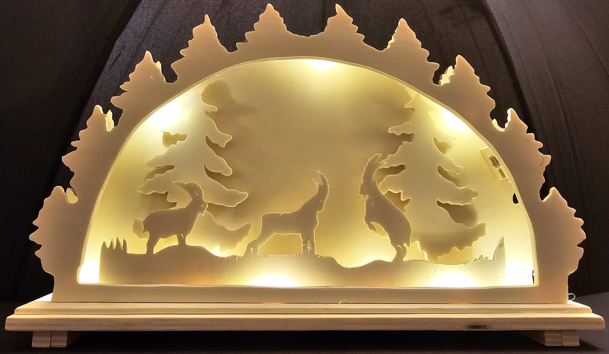 Dieser einzigartige Lichterbogen zeigt zwei kämpfende Steinböcke in einer malerischen Waldlandschaft, die in liebevoller Handarbeit mit der Laubsäge ausgesägt wurde. Die stimmungsvolle LED-Beleuchtung (batteriebetrieben) hebt das beeindruckende Motiv hervor und schafft eine warme Atmosphäre.
