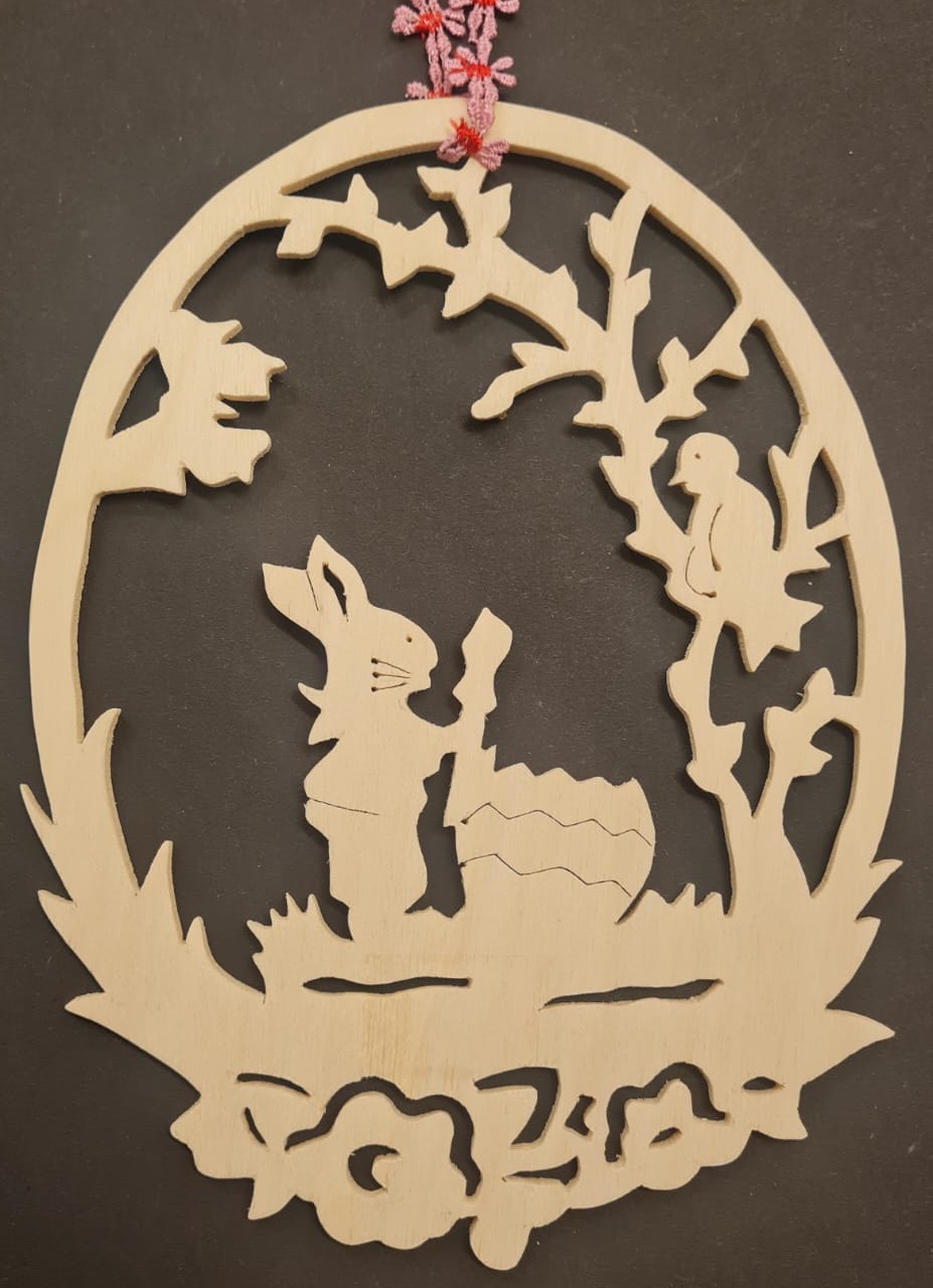 Dieses bezaubernde Holzornament zeigt einen Hasen, der liebevoll ein Ei bemalt, während ein Vogel ihn aus den Ästen eines Baumes beobachtet. Die detailreiche Gestaltung und die präzise Laubsägearbeit machen dieses Dekostück zu einem einzigartigen Highlight. Das feine Band in kräftigem Rot ermöglicht eine einfache Aufhängung und verleiht einen farblichen Akzent.