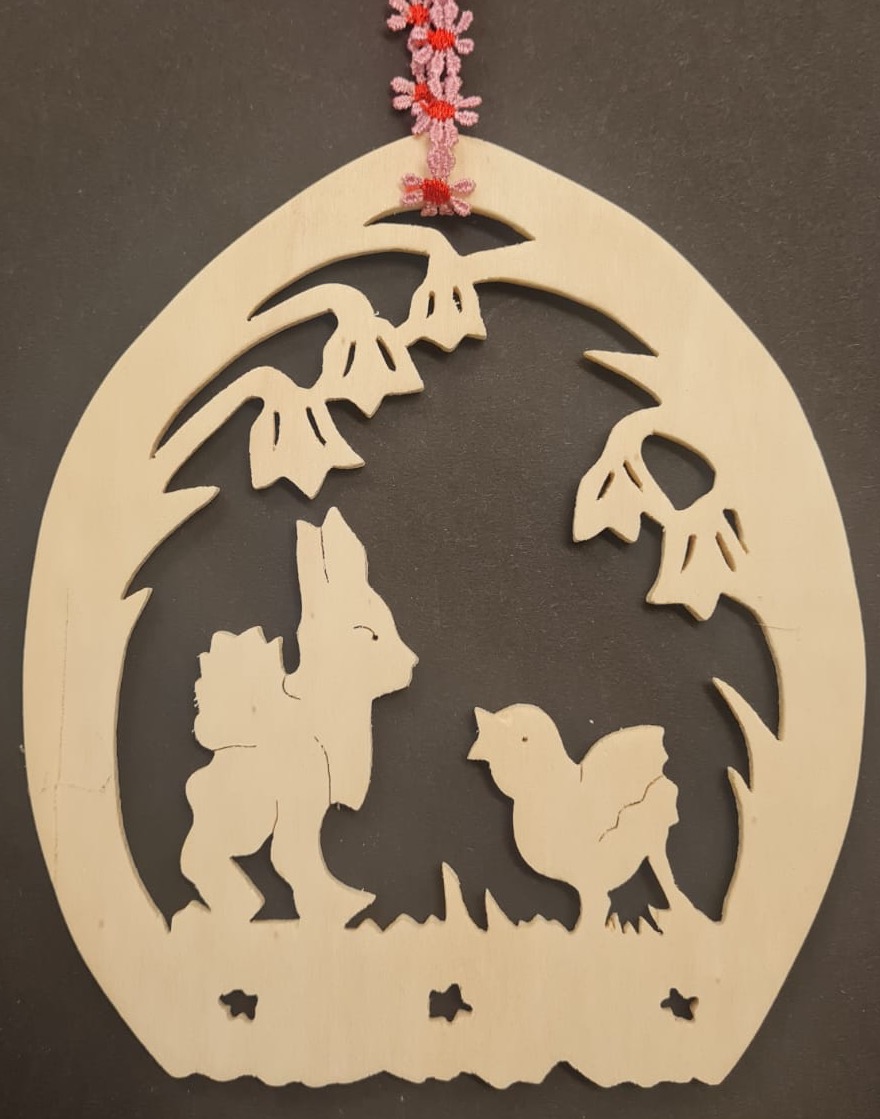 Dieses filigrane Holzornament zeigt eine niedliche Szene mit einem Hasen, der einem Küken gegenübersteht, umgeben von zarten Blüten und einer natürlichen Umgebung. Das präzise Laubsägedesign und das feine rote Band machen dieses Dekorationsstück zu einem besonderen Hingucker.