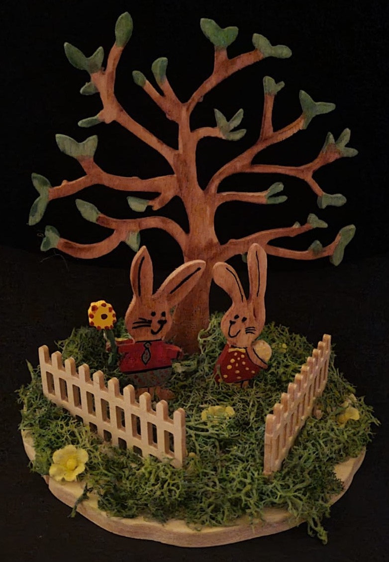 Diese detailreiche Dekoration zeigt eine idyllische Frühlingsszene mit zwei fröhlichen Hasen in einem kleinen Garten, umgeben von Blumen, einem Baum und einem Holzzaun. Die Figuren und Elemente wurden liebevoll von Hand gefertigt und bemalt, um eine natürliche und freundliche Atmosphäre zu schaffen.