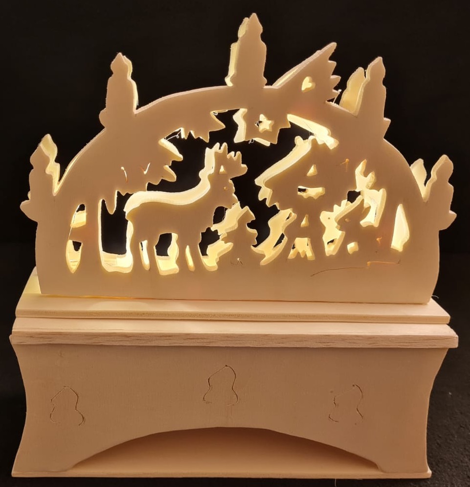 Dieser kleine, handgefertigte Schwibbogen vereint die Schönheit der Natur mit traditioneller Holzkunst. Das filigrane Design zeigt ein Reh und andere Waldtiere inmitten von Tannenbäumen, umgeben von einer sanften Beleuchtung, die die Details dieser idyllischen Szene zum Leben erweckt. Mit seiner kompakten Größe passt dieser Schwibbogen perfekt auf schmale Fensterbänke oder kleine Tische und schafft eine gemütliche, festliche Atmosphäre. Ein zauberhaftes Stück für Liebhaber der erzgebirgischen Weihnachtsdekoration und ideal als Geschenk oder Ergänzung Ihrer winterlichen Dekoration.