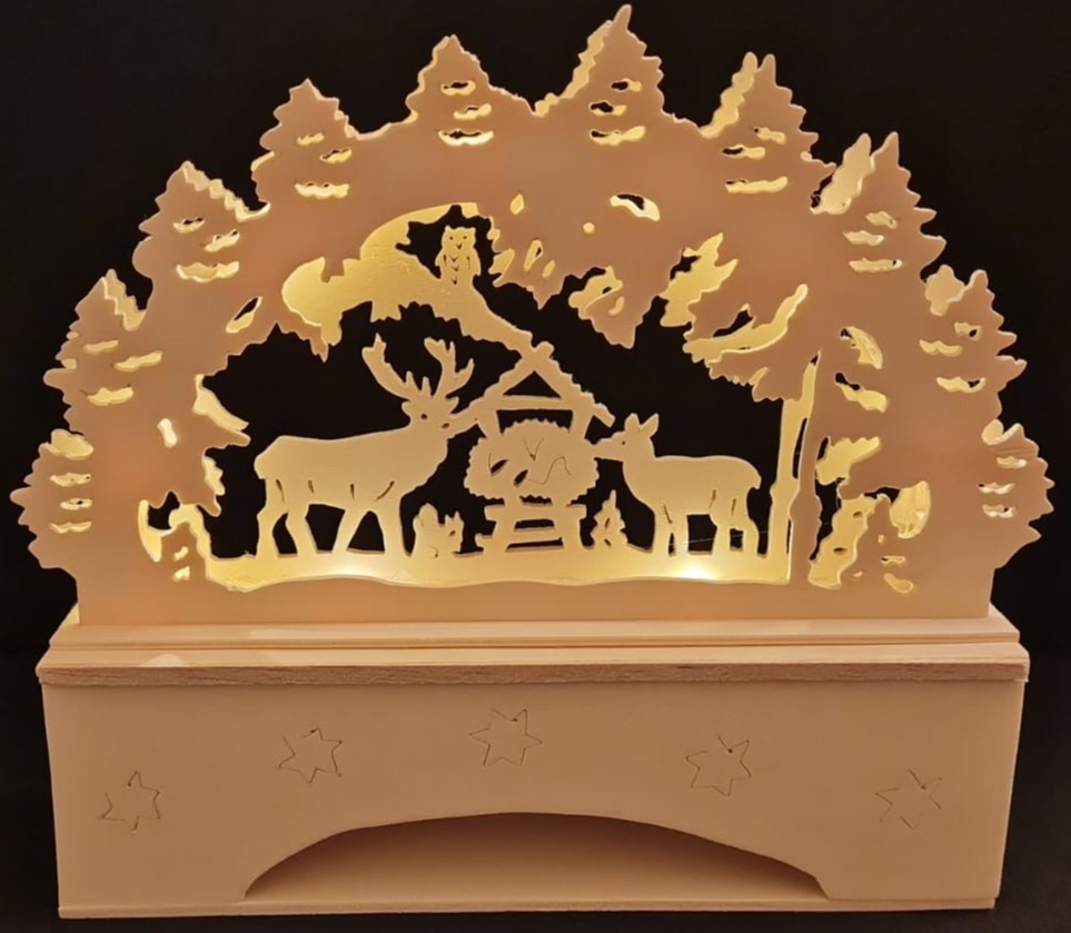 Dieser handgefertigte Schwibbogen aus hochwertigem Holz bringt die Magie des Waldes in Ihr Zuhause. Mit detailreicher Präzision zeigt er eine friedliche Waldszene mit einem majestätischen Hirsch, einem Reh und weiteren Tieren, umgeben von dichten Tannen. Die sanfte Beleuchtung hinter den Figuren verleiht der Szenerie eine warme Atmosphäre und lässt die feinen Details besonders zur Geltung kommen. Ideal als festliche Dekoration auf dem Fensterbrett oder Tisch, sorgt dieser Schwibbogen für Gemütlichkeit und winterlicher Stimmung. Ein echtes Highlight für Liebhaber traditioneller Holzkunst!