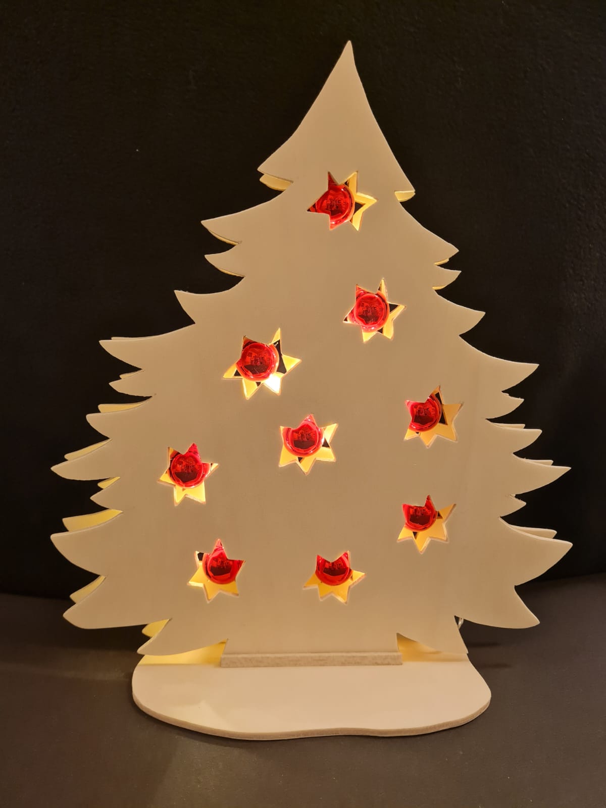 Dieser handgefertigte Holz-Weihnachtsbaum verleiht Ihrem Zuhause eine festliche und stimmungsvolle Atmosphäre. Die leuchtenden Sterne, hinter denen sanftes Licht hervorstrahlt, sorgen für ein warmes und einladendes Ambiente. Die roten Akzente in den Sternen setzen farbliche Highlights und machen den Baum zu einem besonderen Blickfang auf jedem Tisch oder Fensterbrett. Ideal als Dekoration für die Advents- und Weihnachtszeit, bringt dieser Weihnachtsbaum traditionelle Handwerkskunst und moderne Eleganz in Einklang. Perfekt für alle, die eine stilvolle und langlebige Weihnachtsdekoration suchen.